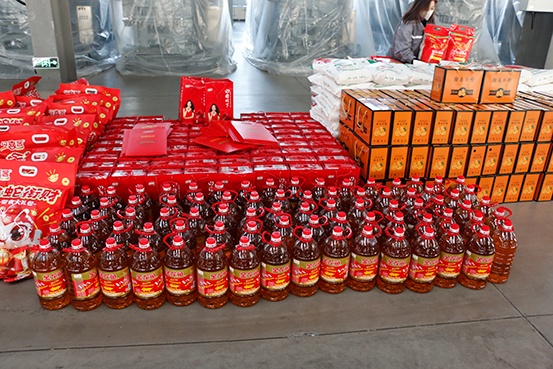 旁邊擺放著一桶桶金黃的食用油,它是生活中不可或缺的調(diào)味品,有了它,每一頓飯菜都能變得更加美味可口。油,也寓意著新的一年里大家的生活能夠如油般滋潤,順順利利,沒有坎坷。