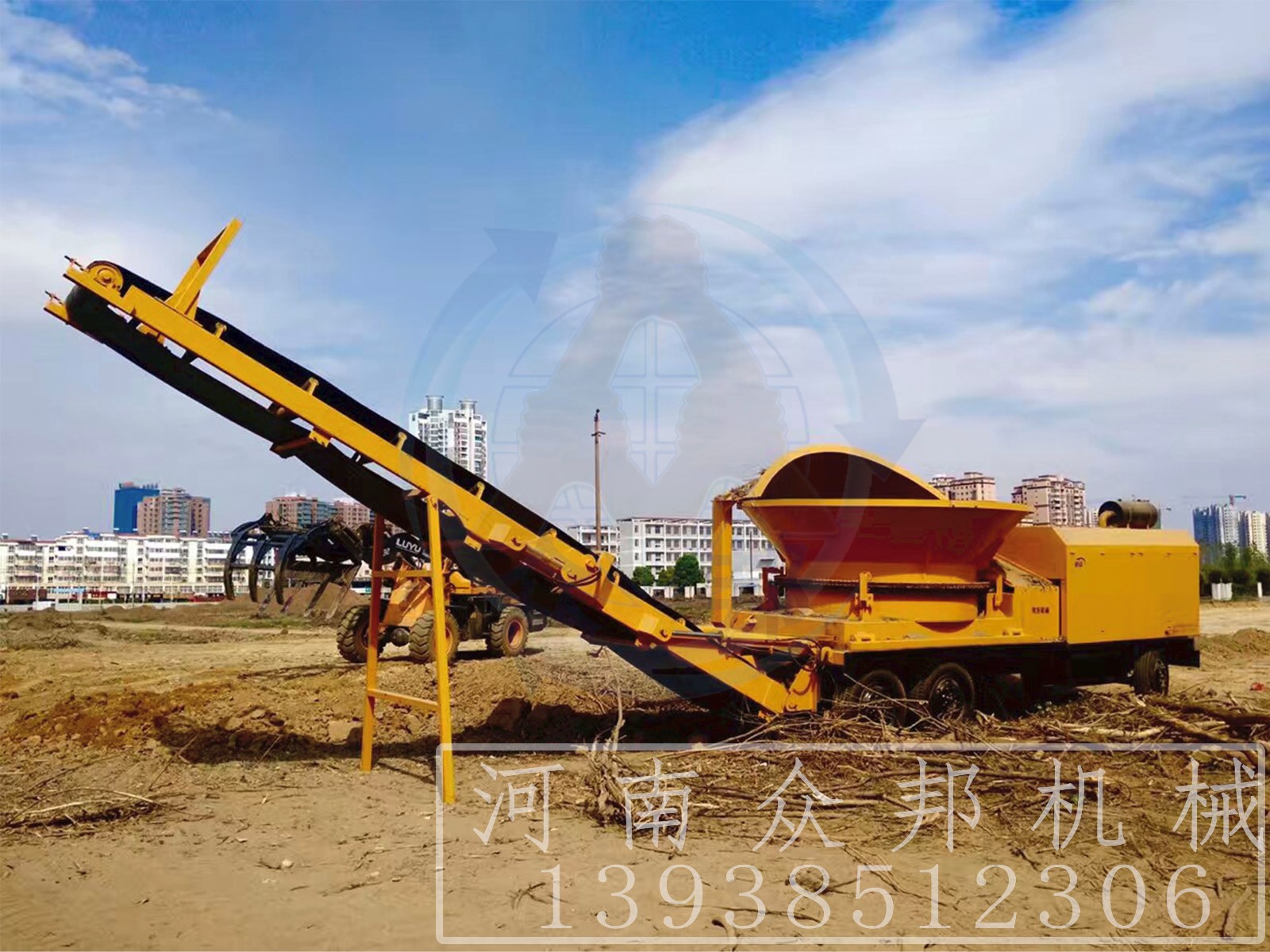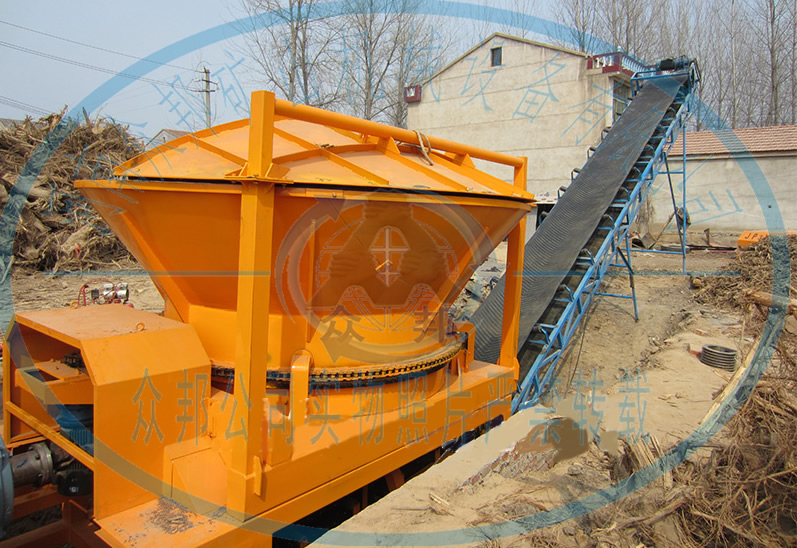 大型木材綜合破碎機(jī)工作時(shí),由電機(jī)帶動(dòng)轉(zhuǎn)子進(jìn)行高速旋轉(zhuǎn),同時(shí)進(jìn)料斗也在電機(jī)的帶動(dòng)下進(jìn)行緩慢的旋轉(zhuǎn),物料經(jīng)抓機(jī)投放進(jìn)料斗,料斗在旋轉(zhuǎn)的同時(shí)內(nèi)壁上的撥料齒會(huì)將物料均勻的撥到轉(zhuǎn)子上,高速旋轉(zhuǎn)的轉(zhuǎn)子碰到物料經(jīng)由轉(zhuǎn)子上刀片的切削和撕扯實(shí)現(xiàn)物料的初步破碎,進(jìn)過初步破碎的物料無在自身重力和轉(zhuǎn)子沖擊力的作用下掉在破碎腔內(nèi)的篩網(wǎng)上,符合要求的物料會(huì)通過篩網(wǎng)排出,而不符合要求的會(huì)在破碎腔內(nèi)進(jìn)行二次甚至三次的破碎加工直至符合要求。